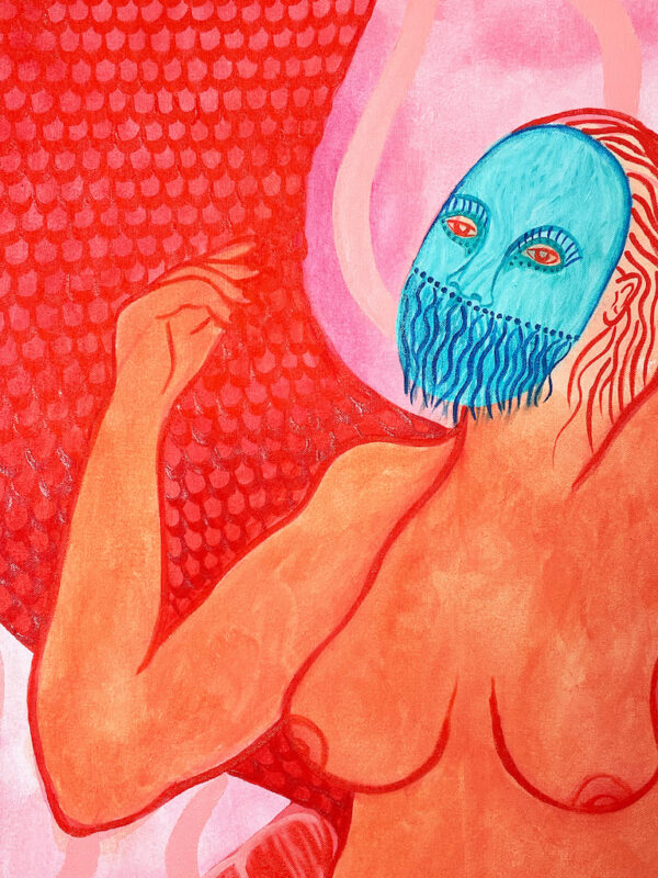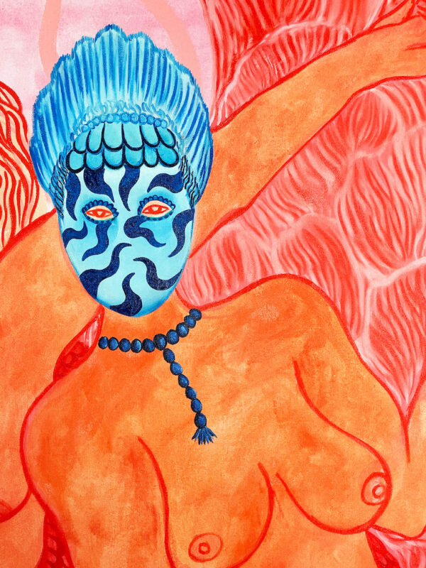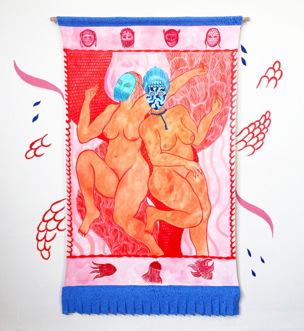 El ile boyanmış koton kumaş, boya macunu, akrilik, kalem, nakış |